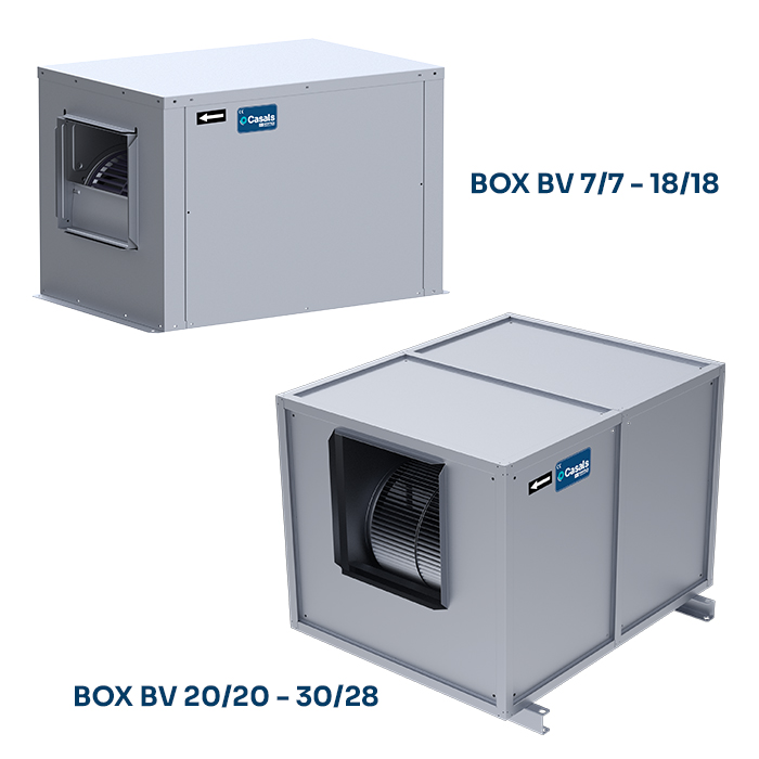 • BV, BVC, BVCR range fans assembles in soundproof cabinets with thermo-acoustic insulation, Bs1d0 fire class on the supply pannel.